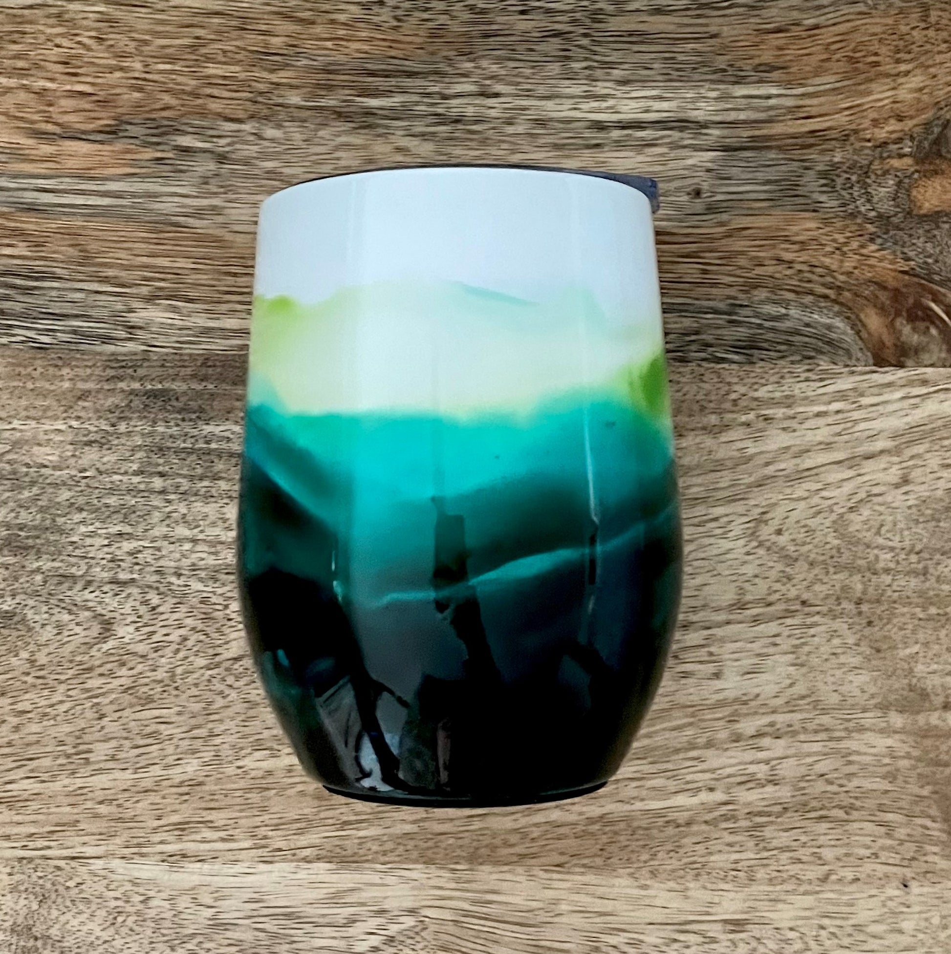 Hand painted with alcohol ink, finished with a durable, non-toxic, UV enhanced gloss topcoat. Each tumbler is unique.