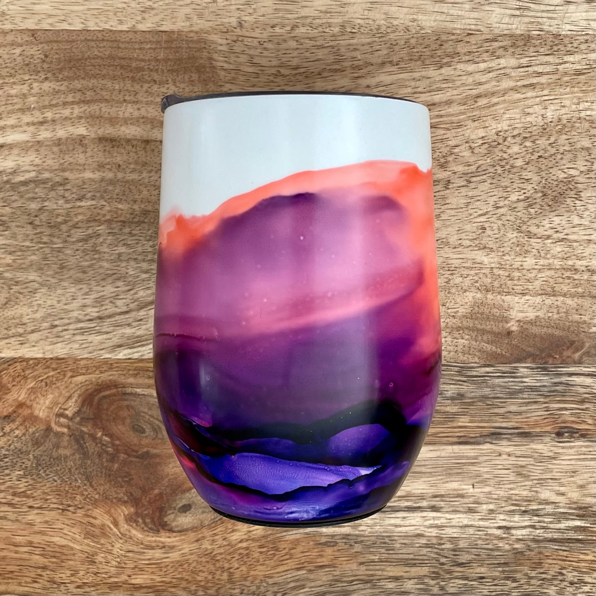 Hand painted with alcohol ink, finished with a durable, non-toxic, UV enhanced satin topcoat. Each tumbler is unique.