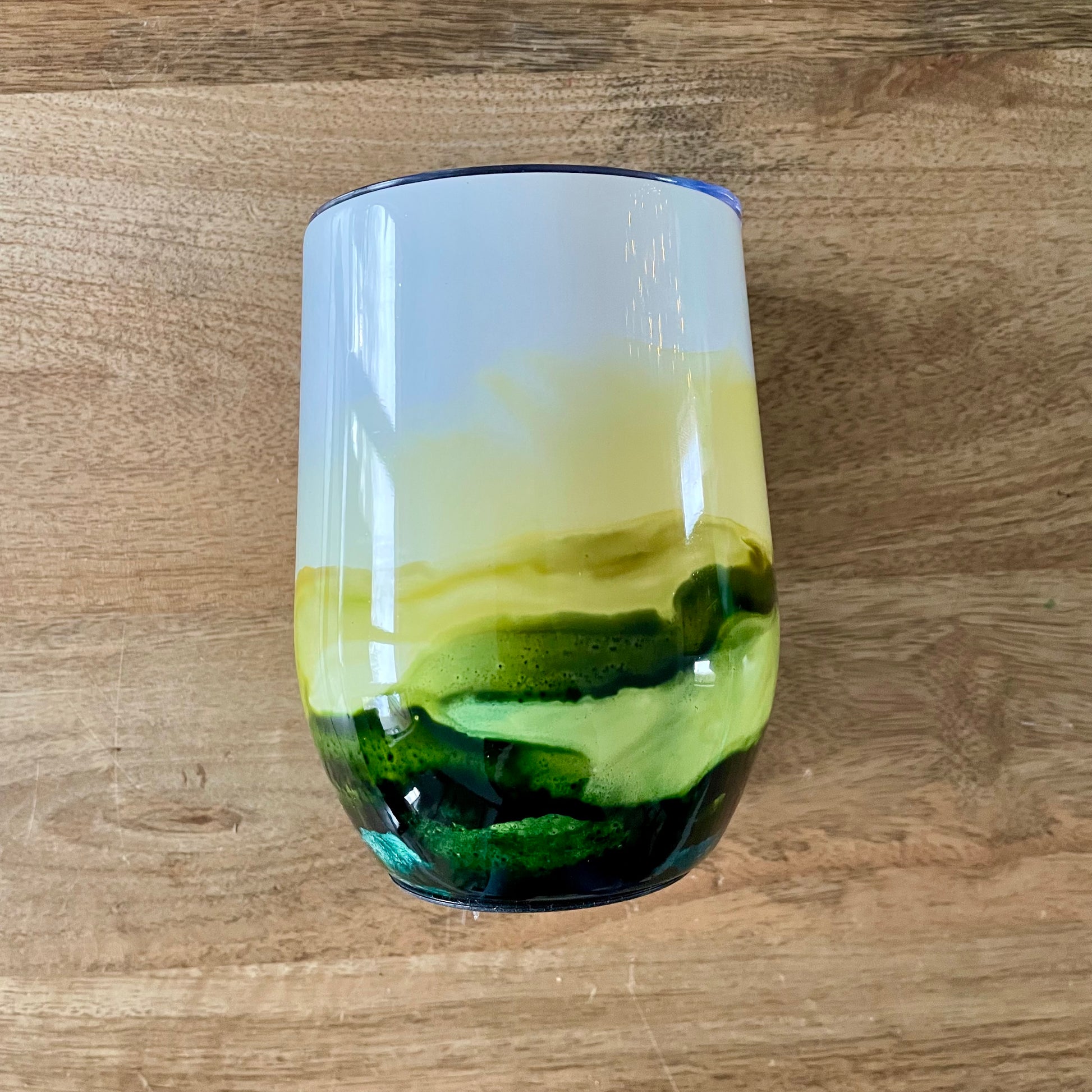 Hand painted with alcohol ink, finished with a durable, non-toxic, UV enhanced gloss topcoat. Each tumbler is unique.