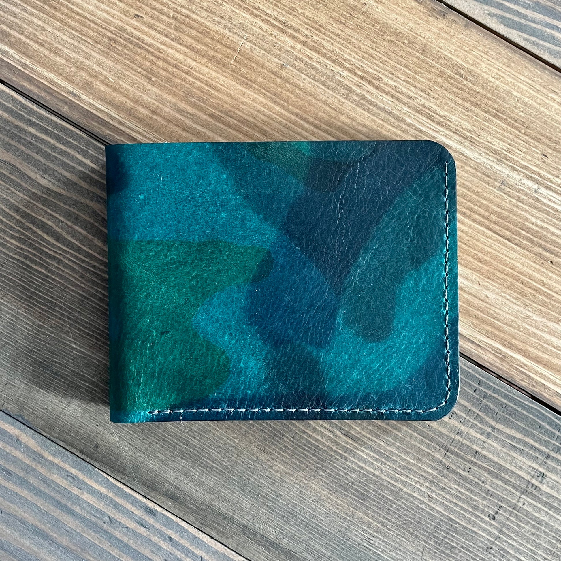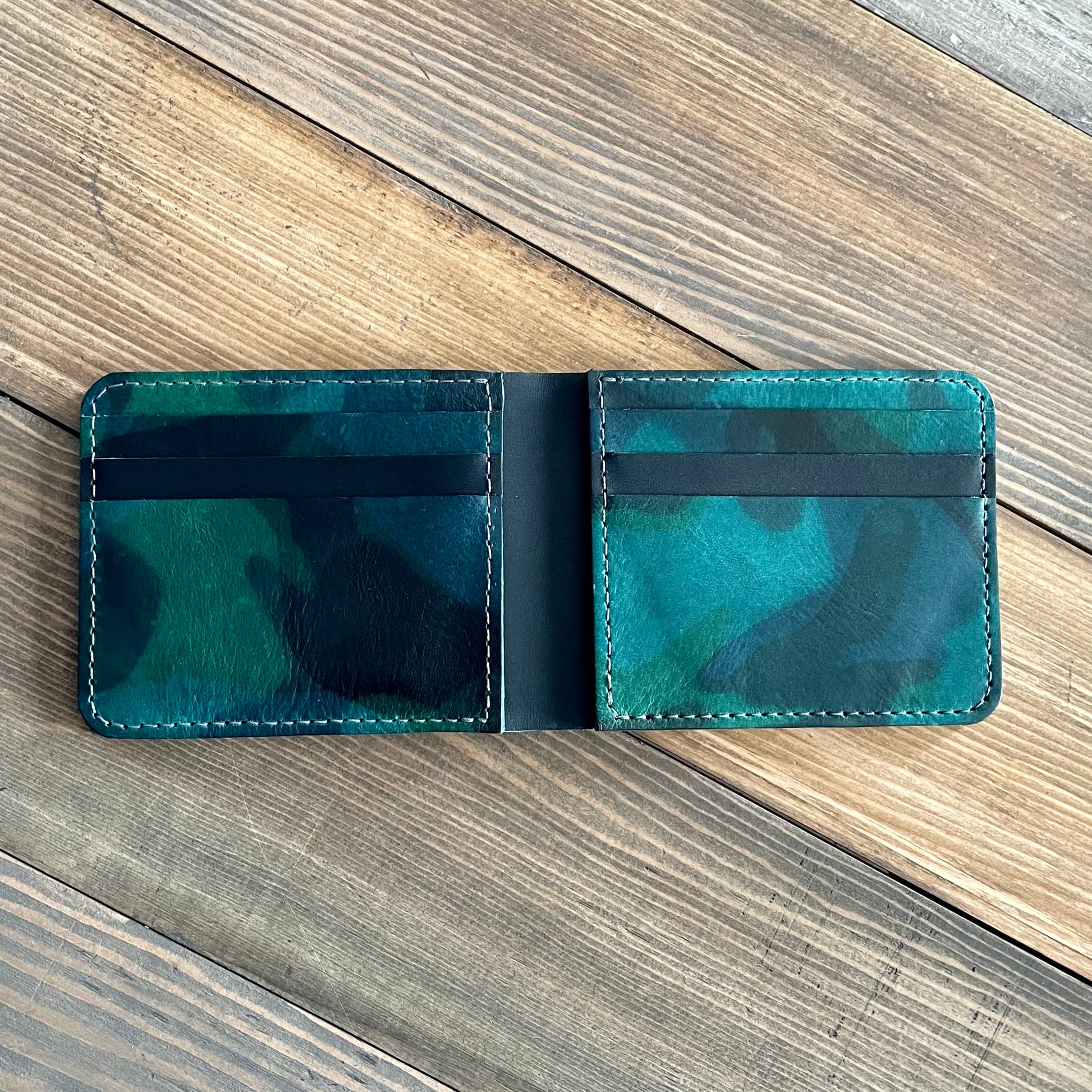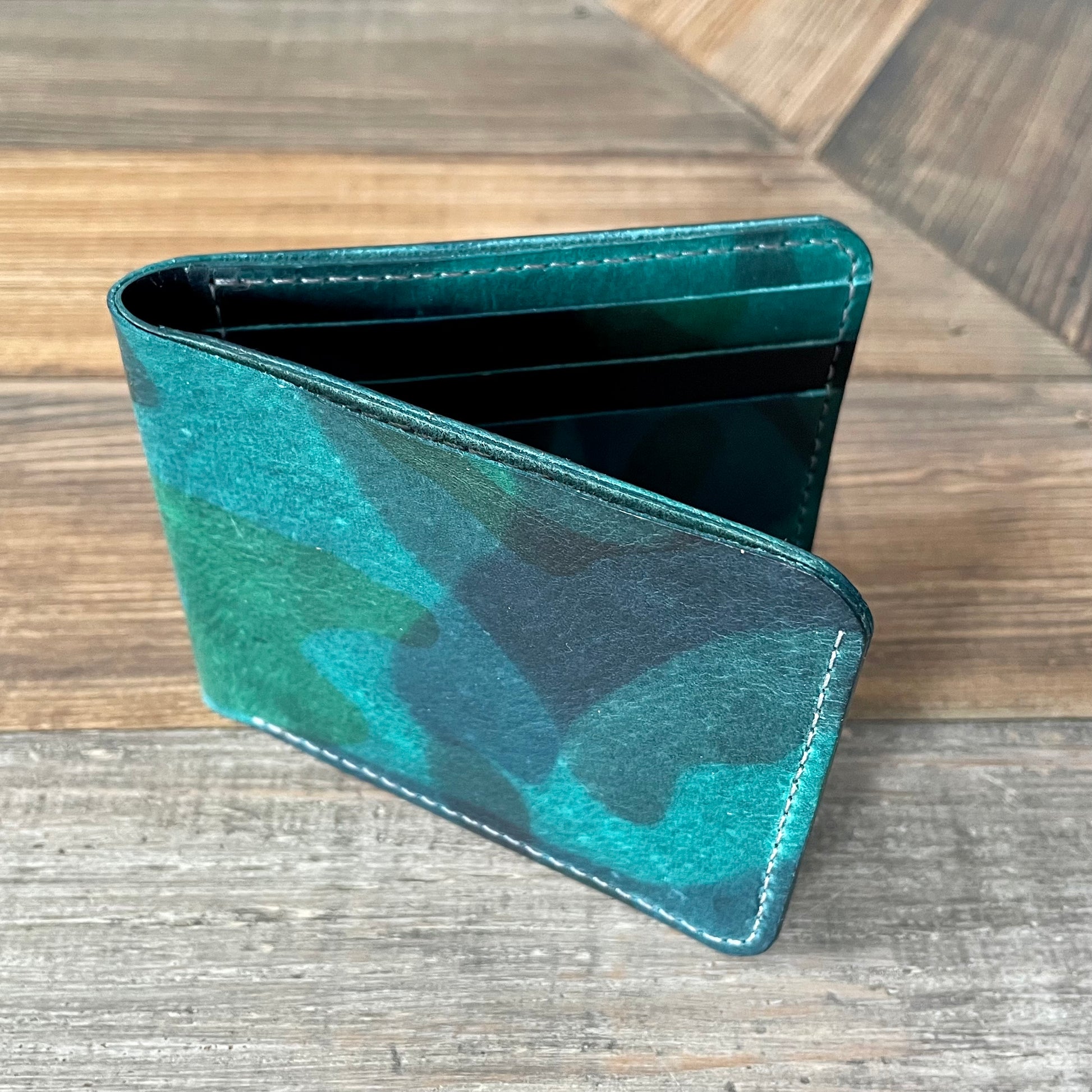 Made from full grain, vegetable tanned leather. This leather comes from the tannery in La Perla Azzurra. The camo is made up of layered blue green shades and has a slight shine. It is very smooth and soft.